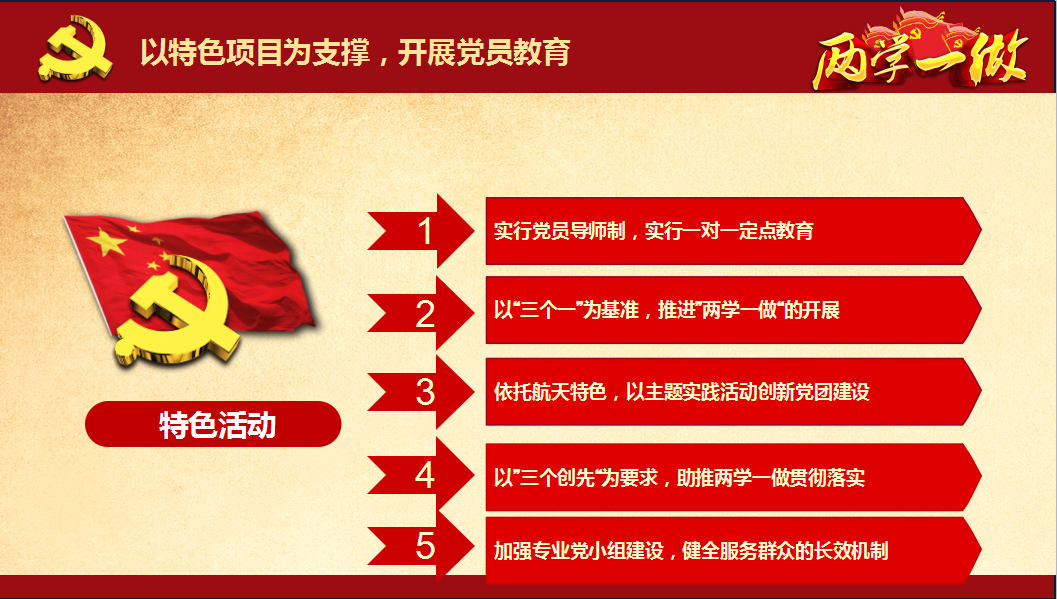 机械工程公司结合“两学一做” 的深入开展情况,制定了以航天特色文化为引导创新员工党建活动的方针开展员工党建工作: