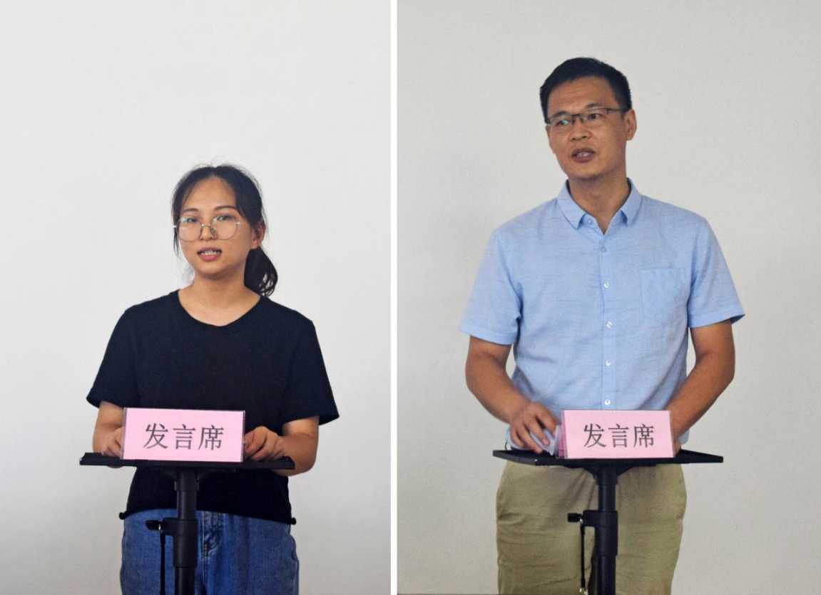 员工代表蒙孔兰与指导教师代表刘坡博士发言