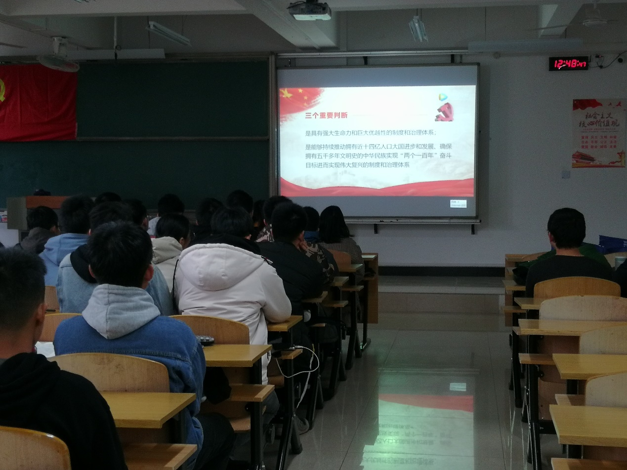 党的十九届四中全会是我们党站在“两个一百年”奋斗目标历史交汇点上召开的一次十分重要的会议。会上,同学集体观看了《解读十九届四中全会精神》讲解视频,深入学习领会党的十九届四中全会精神。会议强调,作为员工党员更要加强理论学习,增强理想信念,时刻以“高标准、严要求”来律己,以“见贤思齐、取法乎上”来立志,以实际行动结合“不忘初心、牢记使命”主题教育把学习学透彻,把活动做扎实。
