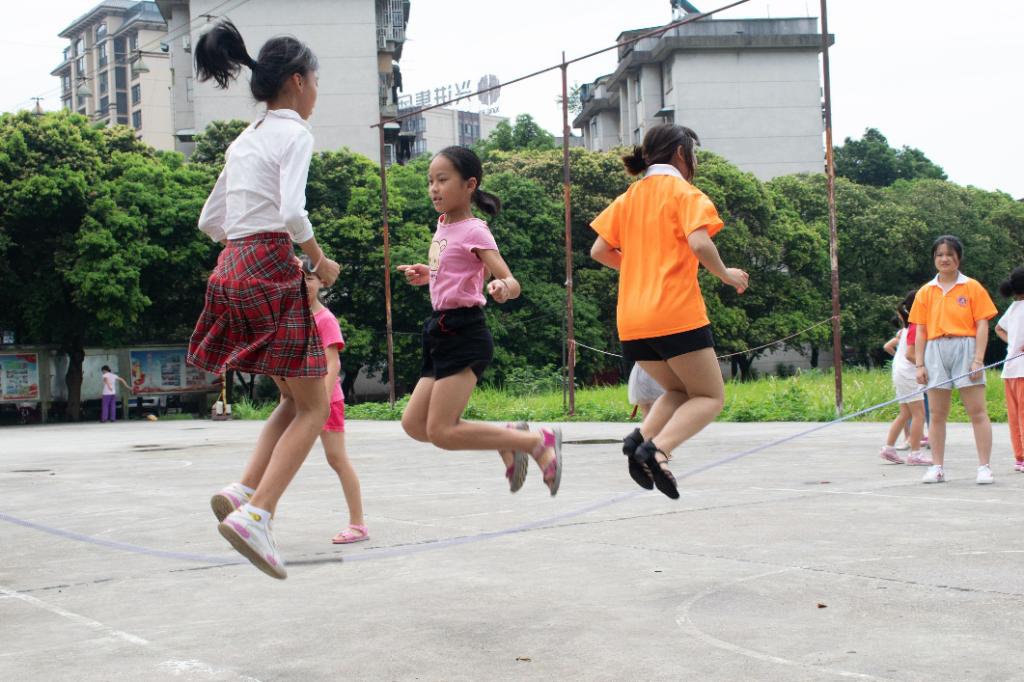 在活动课中团队成员与孩子们一起跳绳 封余溪 摄