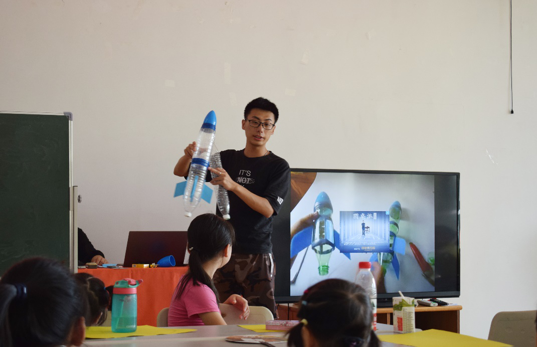 团队特别为小朋友们准备了制作水火箭的材料,在给孩子们播放了制作视频后,讲解其中原理,孩子们深入思考,也将原理说得头头是道。在成员们的帮助下,小朋友们分成小组,积极合作完成了水火箭,并在火箭上加以装饰,有的还给自己做的火箭起了名字。最后要发射火箭了,孩子们露出渴望的眼神,纷纷主动要求来发射,火箭最远的竟然飞到了远处的树上,孩子们兴奋地尖叫起来。团队成员同时进行了航天知识普及活动,通过PPT讲解飞机的结构,外观,飞行速度等一些航模知识以及一些航天文化,用生动的语言为同学们讲解科技内容。