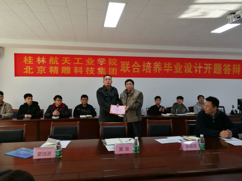 会议中,张政泼教授和黄波董事长对参加开题答辩的25名在北京精雕职业培训第二公司实习,并完成毕业设计的员工进行了细致点评及深刻总结。会议最后,张政泼教授及黄波董事长勉励员工要充分发挥特别能吃苦、特别能战斗、特别能攻关、特别能奉献的航天精神以及桂航优良传统,努力做好毕业设计,顺利完成走上独立工作岗位前的最后一次实战练兵。