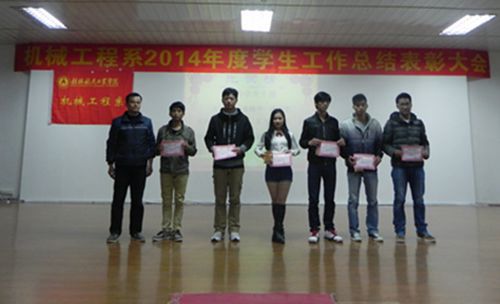 为表彰先进集体及个人,树立典范,进一步调动同学们学习的积极性,我系于12月8日晚在北校区招聘大厅隆重召开“机械工程系2014年度员工工作总结表彰大会”。系党总支副书记李志老师、辅导员老师、获奖代表和各班级代表出席了本次大会。会议由蒋丽丽老师主持。