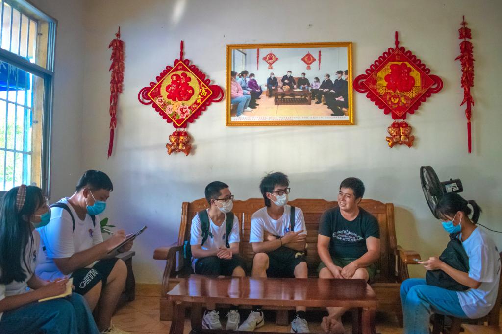 图为实践团队成员在路口观看习近平总书记与王德利一家的合影
