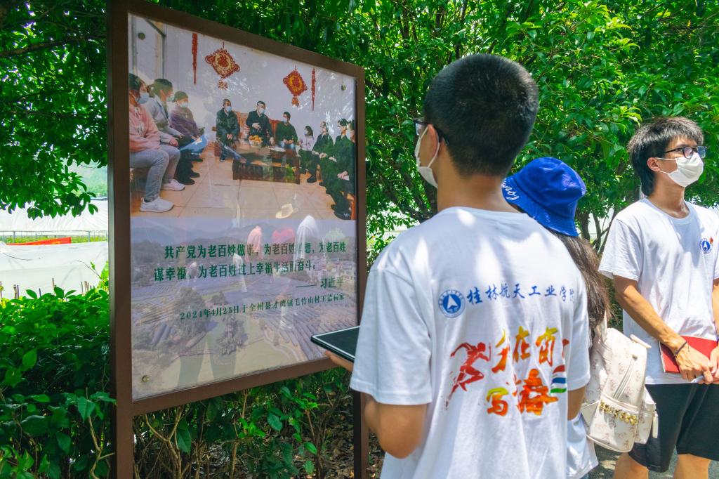 图为实践团队成员在村口观看习近平总书记来毛竹山村调研时的照片