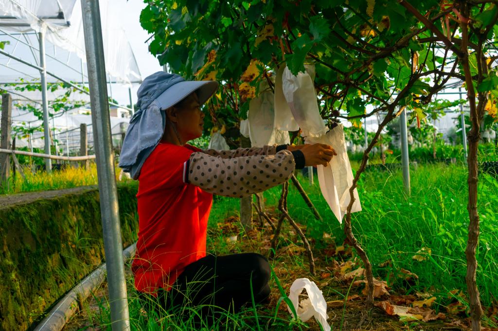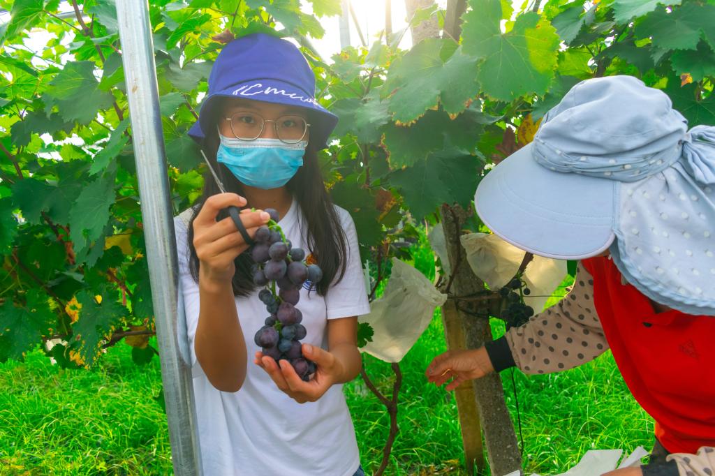 来到葡萄园,隐隐看见村民正忙着给葡萄施肥,剪枝,套袋,葡萄花开满枝头,花香在塑料大棚里弥漫。正在采摘葡萄的村民蒋军秀,热情地带着实践团队走进葡萄地,“过去是种植户盼着老板上门收葡萄,去年毛竹山的葡萄刚上市就受到游客追捧,根本不愁销路。新鲜的葡萄也有了更好的价格,葡萄种植户收入几乎翻了一番。”蒋军秀笑着向实践团队介绍葡萄“阳光玫瑰”,据她所说,这款新引进的葡萄品种又香又甜,去年游客到葡萄园里采摘,能卖到30元一斤。