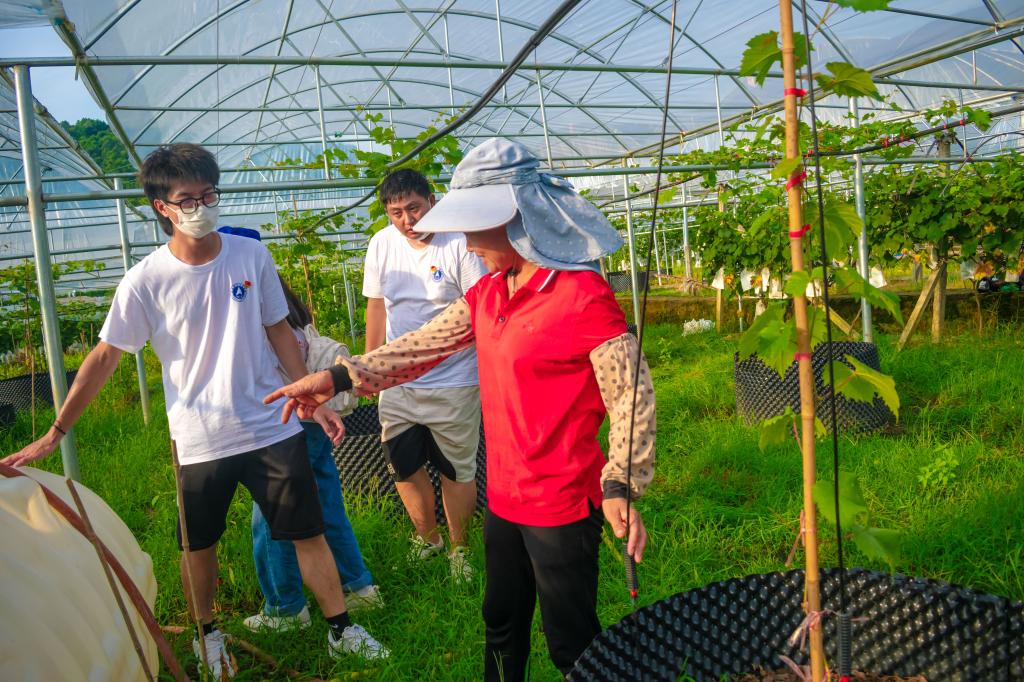 图为许玉玲为实践成员讲解毛竹山村葡萄产业发展情况