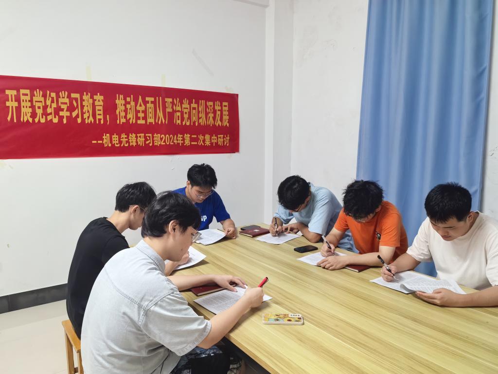 为深入贯彻落实中共中央办公厅《关于在全党开展党纪学习教育的通知》及公司关于党纪学习教育的部署要求,进一步加强员工党员的纪律教育,切实提升其党性修养。2024年4月29日,机电先锋研习部在巡天楼201组织开展2024年第二次集中研讨活动,主题为“开展党纪学习教育,推动全面从严治党向纵深发展”。