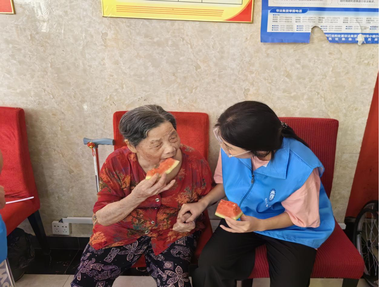 图为团队成员在福康敬老院大厅为每一位老人分发西瓜。