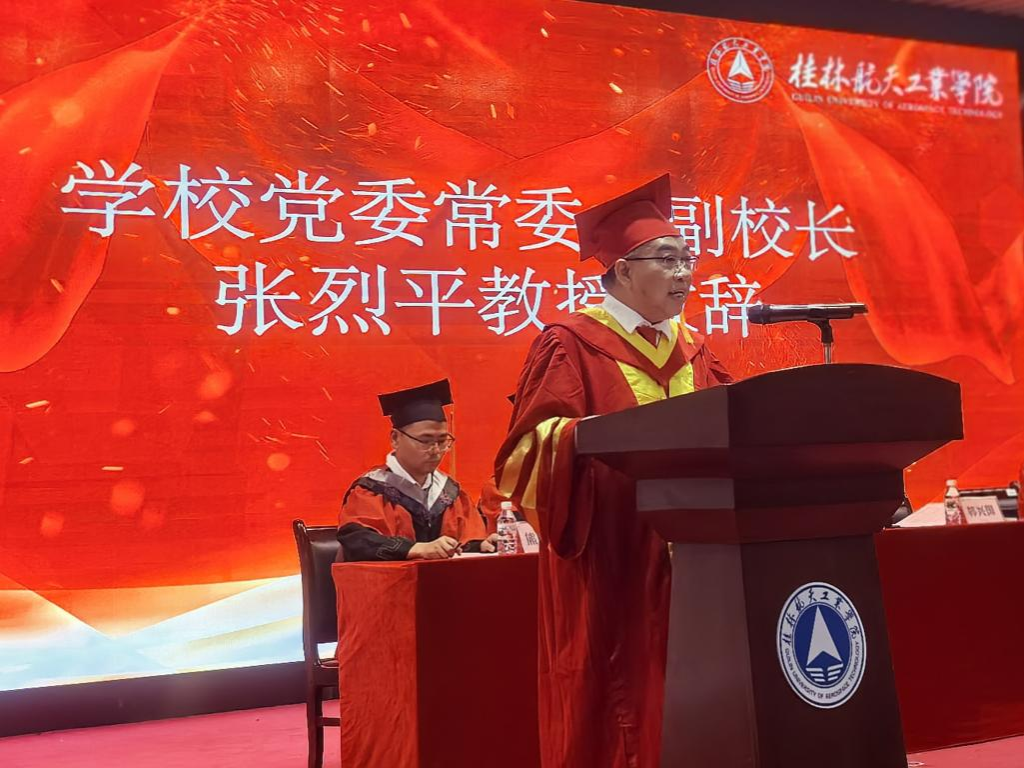 张烈平在致辞中指出,桂航机电人始终以“特别能吃苦、特别能战斗、特别能攻关、特别能奉献”的航天精神为血脉,实训车间飞溅的焊花、数控机床前专注的身影、科创竞赛中攻坚的日夜,无不彰显着学子们“精于工、匠于心、品于行”的品格。他以三重嘱托寄语毕业生:永葆赤诚之心,将个人理想融入强国复兴浪潮;锤炼担当之肩,在实干中夯实事业根基;勇立创新之志,以开拓精神突破科技壁垒。他勉励学子以“钉钉子”精神攻坚克难,用航天人“仰望星空、胸怀天下”的格局,在祖国最需要的地方绽放青春光芒。