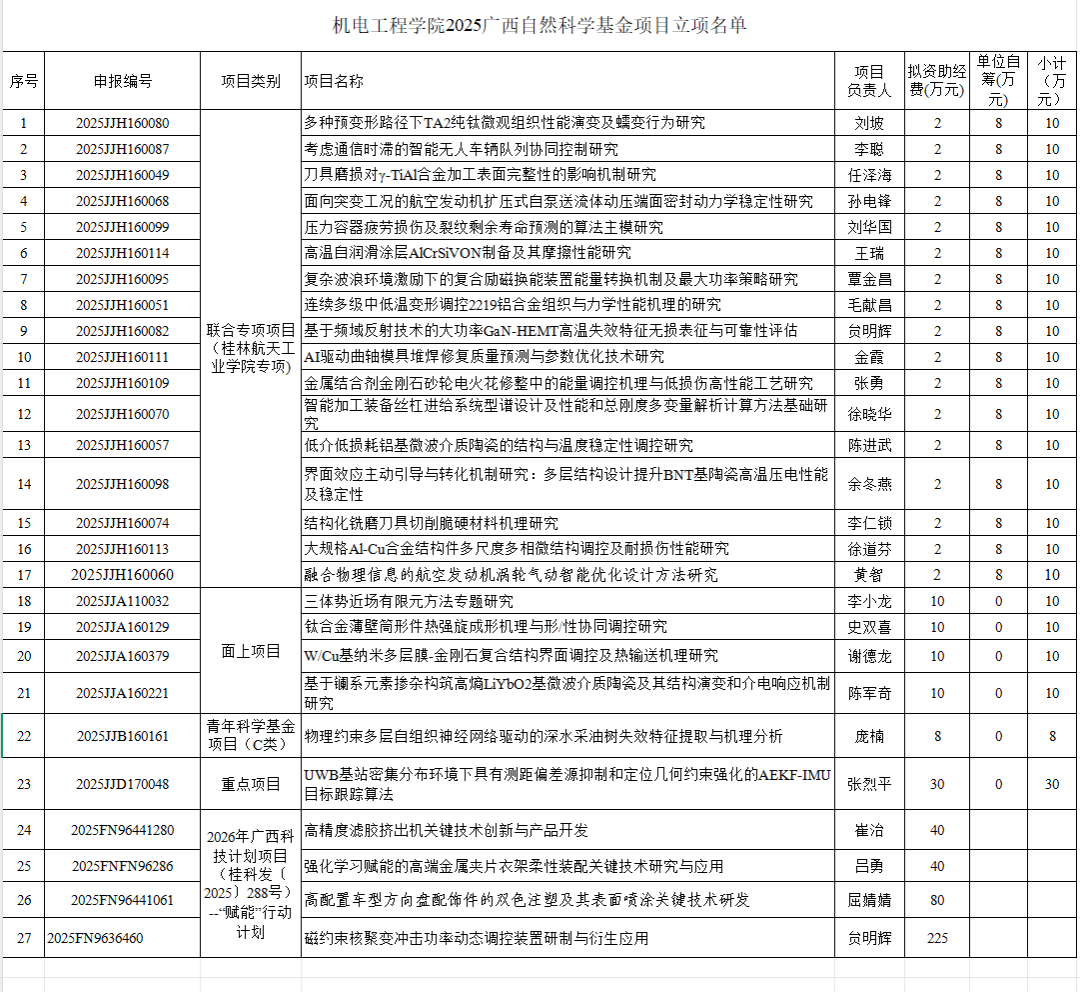 2026年广西科技计划项目评审结果揭晓,公司共获批立项27项,占全校总数86项的31.4%!其中获重点项目1项、面上项目4项、青年项目1项、联合资助项目17项。特此祝贺!