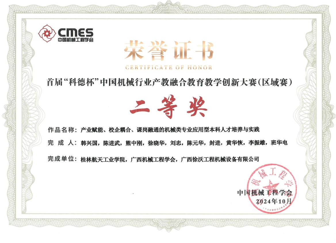 近日,由中国机械工程学会、中国机械行业卓越工程师教育联盟、中国科技发展基金会主办,2024年首届“科德杯”中国机械行业产教融合公司产品创新大赛(区域赛)结果发布,公司韩兴国教授牵头完成的“产业赋能、校企耦合、课岗融通的机械类专业应用型本科人才培养与实践”获大赛二等奖。