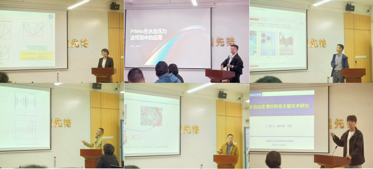 随后,5位博士教师和1名研究生代表详尽报告了各自研究领域的研究工作、研究方法、研究思路。博士代表金霞、陈俊名、杨家志、王为庆、覃金昌和研究生代表分别以题为“多场耦合多学科优化方法研究”、“基于人工智能的复杂机械系统自适应故障诊断技术研究”、“水底地形测绘用激光雷达(LiDAR)控制系统研究”、“基于图像匹配的精确定位技术研究”、“波浪直驱发电技术研究”、“多自由度增材制造关键技术研究”做了专题汇报。