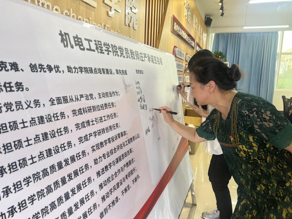 最后,谢雄辉带领与会党员重温入党誓词,并在庄严承诺签名墙上进行了签名,全体教工党员承诺攻坚克难、创先争优——助力硕点培育建设、率先完成各项指标任务。