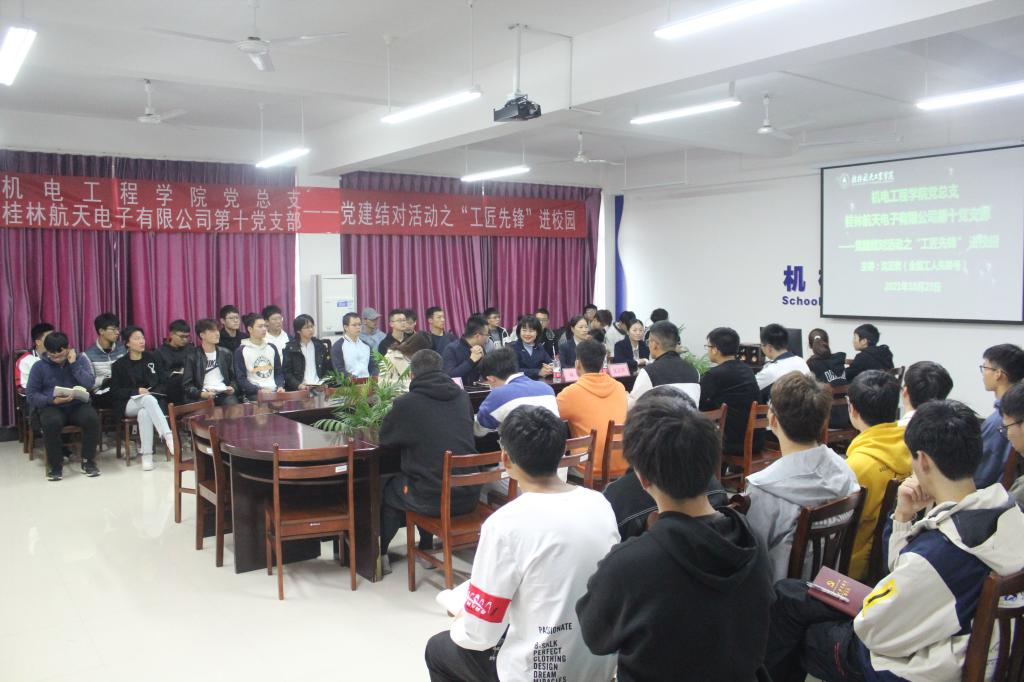 10月23日下午,公司党总支和桂林航天电子有限公司第十党支部联合举办“航天工匠先锋进校园”主题讲座活动,活动在巡天楼205会议室举行。桂林航天电子有限公司第五党支部书记林媛,第十党支部委员王玲、“全国工人先锋号”绕线班组长沈正欢,公司团委书记、员工党支部书记及60余名员工代表参加活动。