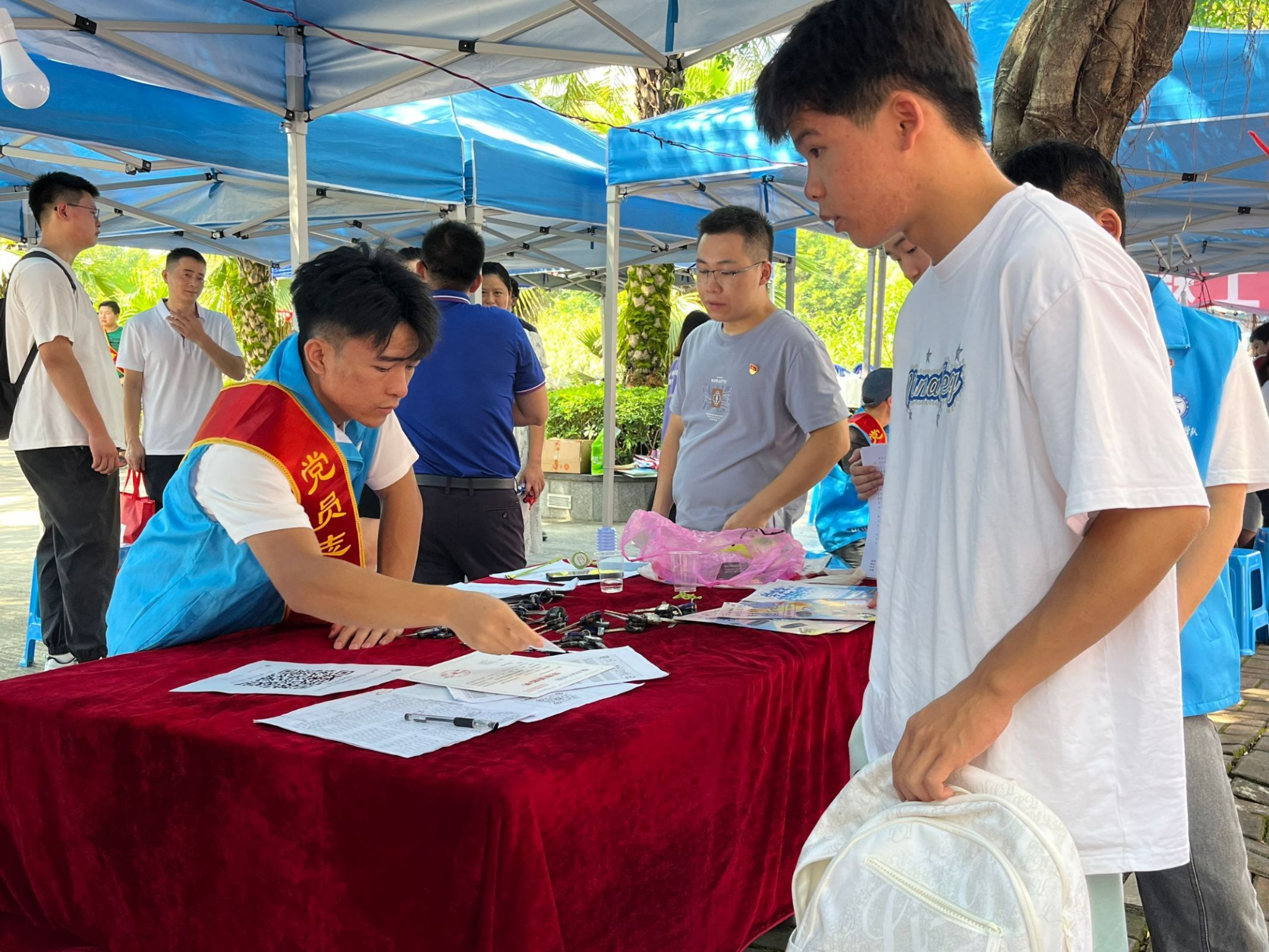 此次迎新活动提前对迎新现场进行布置,包括设置党员服务岗、悬挂横幅标语、摆放指示牌等,营造浓厚的迎新氛围。志愿者们身着统一蓝色上身马甲的志愿者服装,佩戴党员徽章,戴上绶带,面带微笑,为新生们提供帮助。