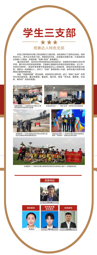公司员工第三党支部现有党员44名,由3名教师党员和41名员工党员组成,其中正式党员28名、预备党员16名,2021级员工党员33名、2022级员工党员8名。支部作为竞赛达人特色支部,始终坚持以“党建+实践”相结合,近3年来,支部在挑战杯、“互联网+”等学科竞赛中获省部级及以上奖励20余项,涌现出一批竞赛达人。同时为充分发挥党员的先锋模范作用,成立了“榜样·追寻”优秀报告员工党员团队,通过树典型、重宣传、强引导,营造出“学先进、看典型、比创新、赛学风”的良好氛围,引导并激励更多员工党员在各个领域树立新的标杆。