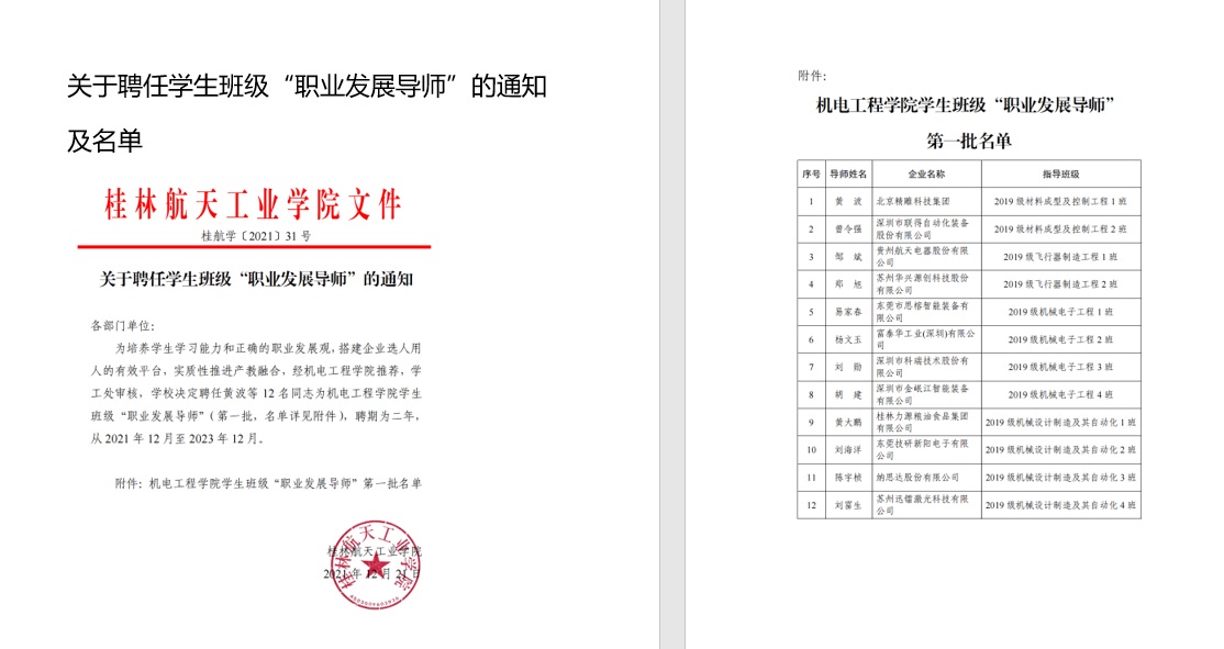 2021年 关于聘任员工班级“职业发展导师”的通知及名单