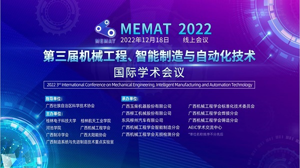12月18日,由广西壮族自治区科学技术协会指导,在广西机械工程学会的大力支持下,公司联合桂林电子科技大学、河池公司、广西制冷学会、广西太阳能协会、广西制造系统与先进制造技术重点实验室主办,AEIC学术交流中心承办的第三届机械工程、智能制造与自动化技术国际学术会(MEMAT2022)在线上顺利举行。广西机械工程学会理事长、桂林电子科技大学副董事长潘开林出席会议并为大会致辞。会议由学会常务副理事长高兴宇主持。