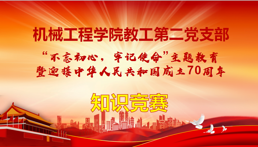 为庆祝中华人民共和国成立70周年,学习宣传党的十九大精神,深入学习贯彻习近平新时代中国特色社会主义思想,调动党员同志读原著、学原文、悟原理的积极性、主动性,为深入开展“不忘初心、牢记使命”主题教育,丰富学习教育形式,推动党员同志学习新思想、践行新理念、展现新作为,机械工程公司教工第二党支部于9月25日下午举办了“不忘初心、牢记使命”主题教育暨迎接中华人民共和国成立70周年党建知识竞赛活动。