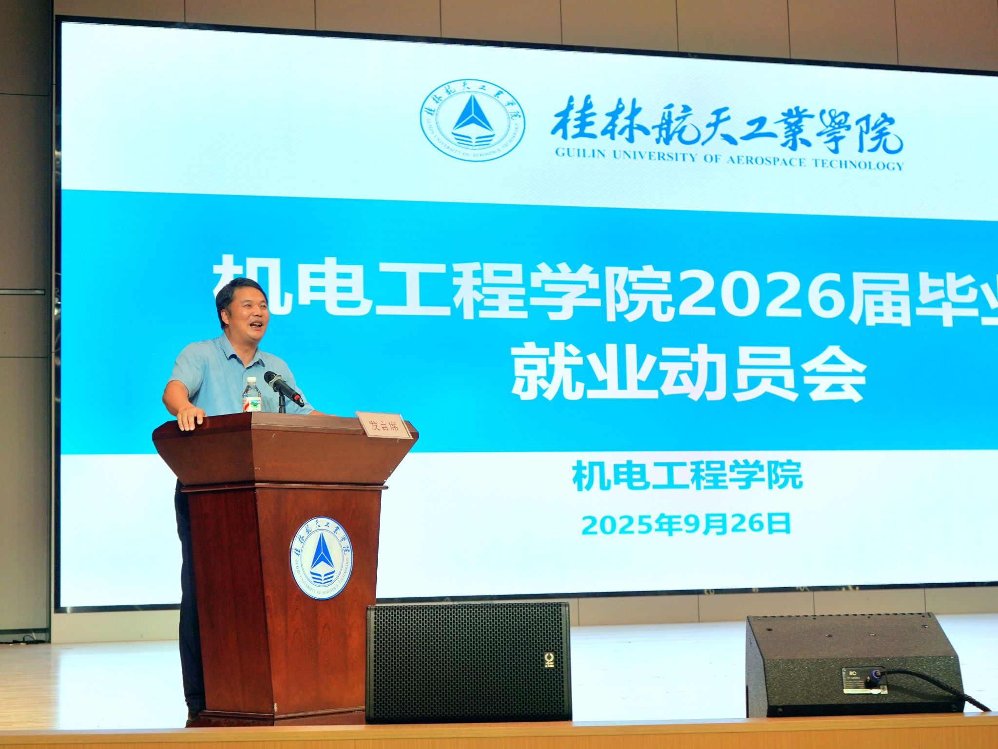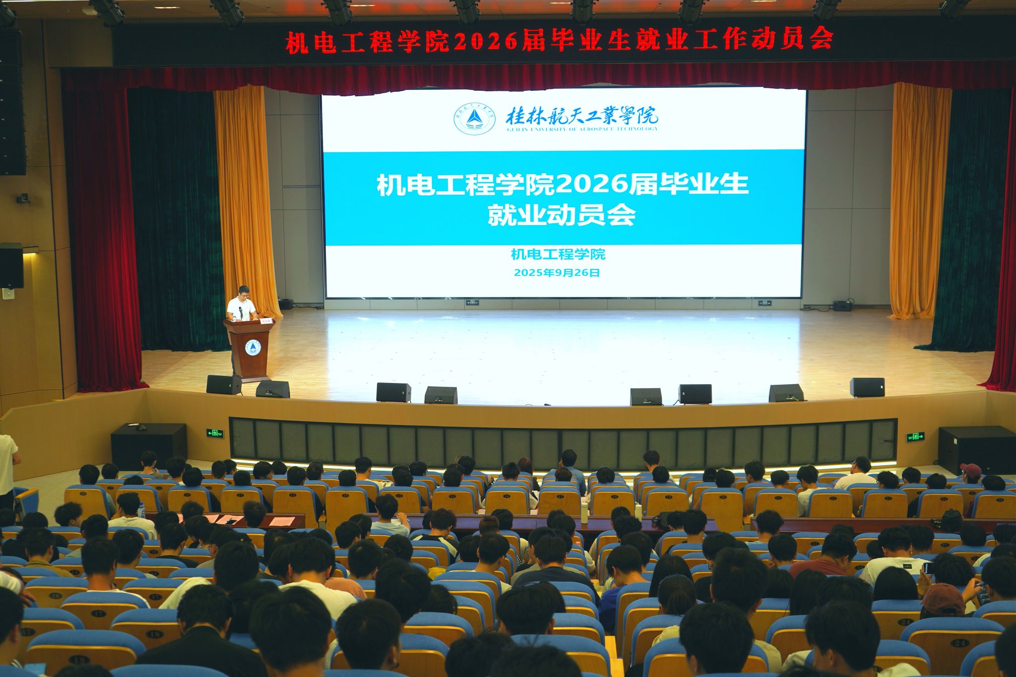 会上,杨华以“认清形势、坚定信心、主动出击”为主线,为同学们加油鼓劲。他结合国家制造业转型升级和航天强国战略对高素质技术人才的迫切需求,指出机电学子大有可为、大有作为。同时,他深情寄语毕业生“四珍”箴言:珍惜时代机遇,珍重青春韶华,珍爱自身优势,珍藏桂航底色。他勉励大家以“敢闯敢试”的锐气、“善作善成”的韧劲,在求职路上勇敢迈出第一步,用实干赢得未来,用奋斗定义青春。